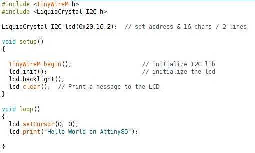 #include <TinyWireM.h> #include <LiquidCrystal_I2C.h> LiquidCrystal_I2C lcd(0x20,16,2); // set address & 16 chars / 2 lines void setup() { TinyWireM.begin(); // initialize I2C lib lcd.init(); // initialize the lcd lcd.backlight(); lcd.clear(); // Print a message to the LCD. } void loop() { lcd.setCursor(0, 0); lcd.print("Hello World on Attiny85"); }