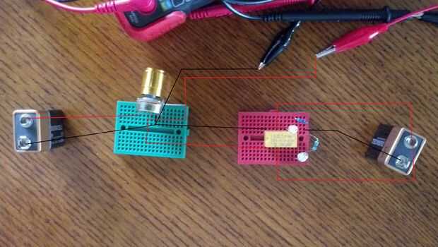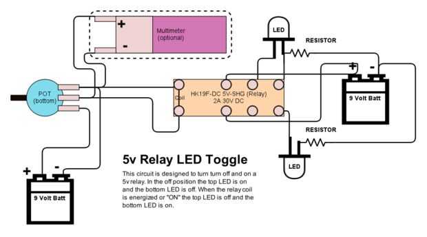 El primer cableado utiliza dos baterías de 9 voltios. Una batería está conectada a un potenciómetro de 1K. La salida del potenciómetro se conecta al relé para controlar el interruptor. Otra batería de 9 voltios se utiliza para alimentar los LEDs. Cuando el potenciómetro se gira una forma se reduce la resistencia haciendo que la corriente y voltaje para aumentar. Cuando se aplica suficiente energía, la bobina del relé se convierte en energía y acciona el interruptor de relé. Esto hace que el poder de cambiar de un LED a otro. Así que la originalmente "En" el LED se apaga y el originalmente "OFF" LED se. Así que siempre hay un LED "ON" y un "OFF".