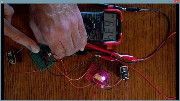 Ahora, gire el potenciómetro de la dirección opuesta, aumentando lentamente la resistencia. Viendo el multímetro el voltaje desciende prestando atención a cuando el relé se desactiva (otra vez se oirá el interruptor mecánico del tirón). En esta demostración el relé se desactiva alrededor.6 voltios (probablemente más cercano a.5. Hay aproximadamente un rango de 2 voltios entre y apagando.