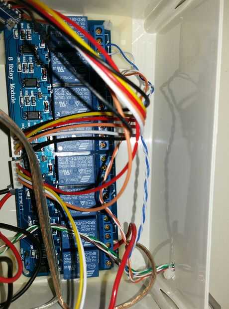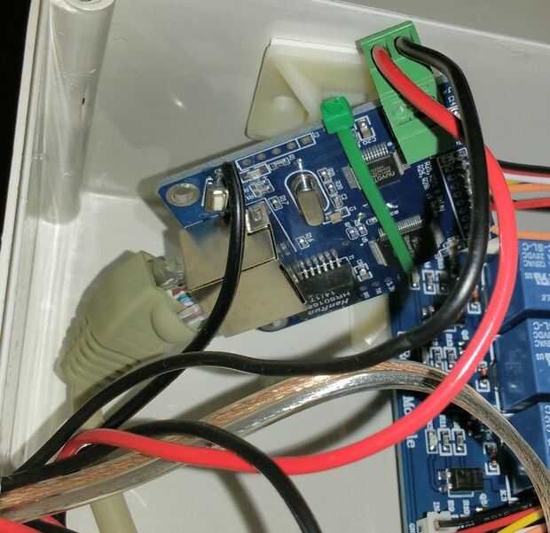 usé una caja de pvc de 6 pulgadas para albergar el dispositivo imatic. Requiere 5volts para poder para arriba. Soldado los cables de extensión (no necesarios!) para proporcionar facilidad de instalación para mis necesidades futuras. Normalmente el imatic conecta directamente a la tarjeta de 8 relé. Una vez alimentado un azul led parpadeará más LED en el conector RJ45 se encenderá cuando se inserta el cable cat5e.