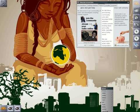 Dyne: bolic es una distribución de GNU/Linux que se ejecuta desde un CD y capaces de reconocer la mayoría de sus dispositivos y periféricos: sonido, video, TV, tarjetas de red, firewire, dispositivos USB y mucho más. Se forma en las necesidades de los activistas de los medios de comunicación, artistas y personas creativas, una herramienta práctica para la producción multimedia. Puede manipular y transmitir sonido y vídeo con herramientas para grabar, editar, codificar y corriente, todo usando software liberan!