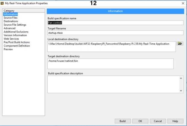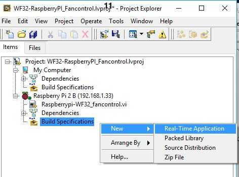 - Tirar "Raspberrypi-WF32_Fan_Control" en la sección de frambuesa Pi 2 construir especificaciones click derecho y elegir nuevo» aplicación en tiempo real.