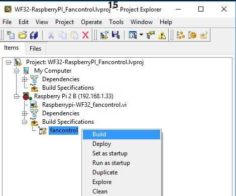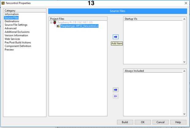 - En proyecto, archivos Seleccione el nivel superior VI ("Raspberrypi-WF32_Fan_Control") y haga clic en la flecha derecha para agregar a vis de Inicio haga clic en Aceptar.
