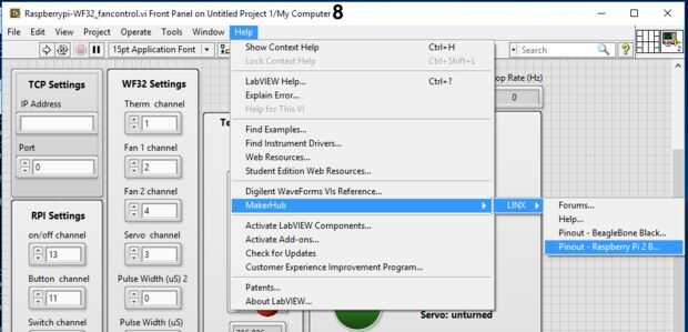 - Siguiente paso es abrir un diagrama del pinout para el frambuesa Pi 2 para su uso posterior. Desde el panel frontal, seleccione ayuda» MakerHub» LINX» "Pinout - frambuesa Pi B"