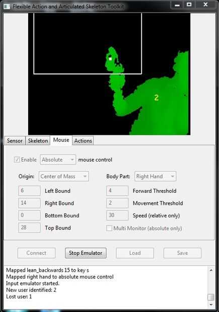 Estos ajustes están diseñados para que la pistola de Nerf a rastrearse en altura de los hombros, en la mano derecha (de pie unos 5/6 pies desde el Kinect). FAAST lo activa es el seguimiento cuando pulse conectar, emulación de inicio y luego la onda la pistola Nerf frente del Kinect hasta que aparece un punto de foco blanco en la imagen de rastreo.