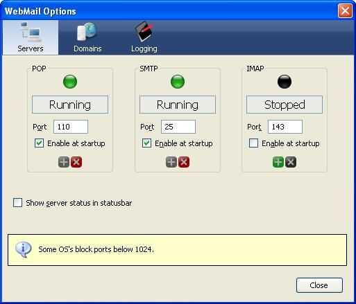 Ir a Herramientas > Complementos y en el Webmail, haga clic en Opciones. En la pestaña de servidores , asegúrese de POP, SMTPy IMAP están todos funcionando. Si el estado es detenido o Error, entonces probablemente necesite abrir el puerto especificado en su Firewall o Router o módem.