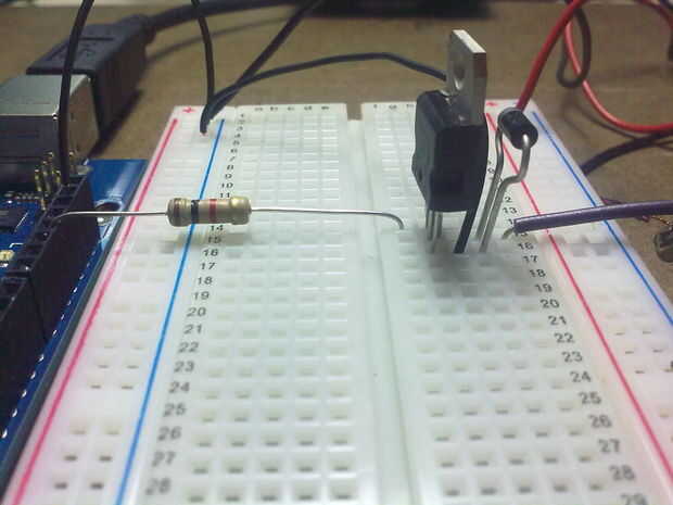 El TIP120 es un elemento muy robusto. Puede manejar gran cantidad de energía (ver especificaciones), pero el Arduino no puede. Así que debemos proteger el Arduino de potenciales intrusos de partido. Para empezar, utilizamos un resistor de 1K ohmios entre los pines de Arduino y el pin de Base TIP120. Se trata de un seguro contra cortocircuitos eléctricos. El TIP120 puede manejar 60V y 5A pero te aseguro que el Arduino no.
