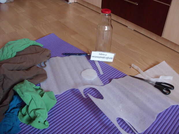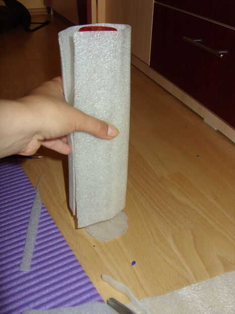 PASOS: 1) Envuelva el material de aislamiento alrededor del vidrio, corte el exceso, para obtener la forma redonda básica poner la botella de vidrio en el material, dibujar el contorno y cortar la forma
