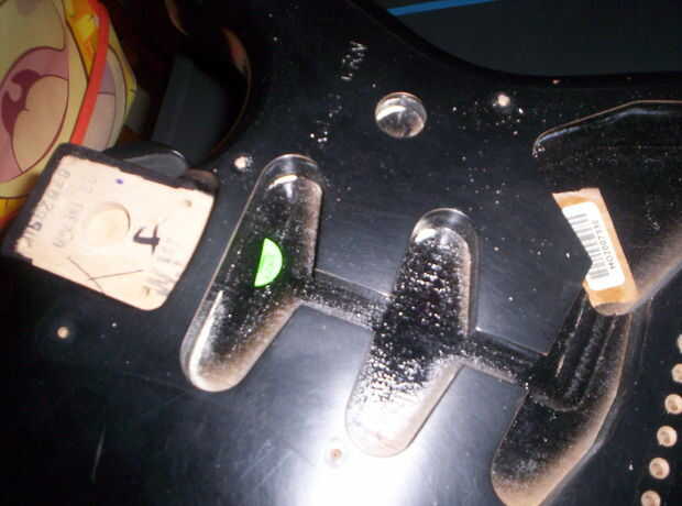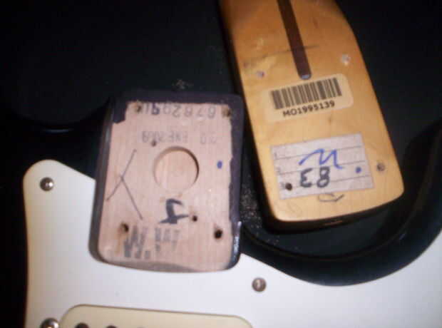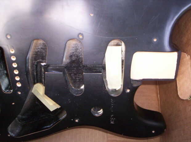 Después de jugar la nueva Strat por unas horas y darse cuenta de que necesita una configuración, yo estaba feliz de llevarlo aparte para empezar el proyecto. Una Strat es una de las guitarras más fácil desmontar ya que la mayoría de la electrónica se unen en el golpeador. Además, enmascarado de los números de serie y las etiquetas de producción encontradas en el bolsillo del cuello y el cuerpo. Puse un pequeño trozo de papel sobre las pegatinas, luego poner cinta adhesiva sobre la zona, así que la cinta no levante las pegatinas al retirar.