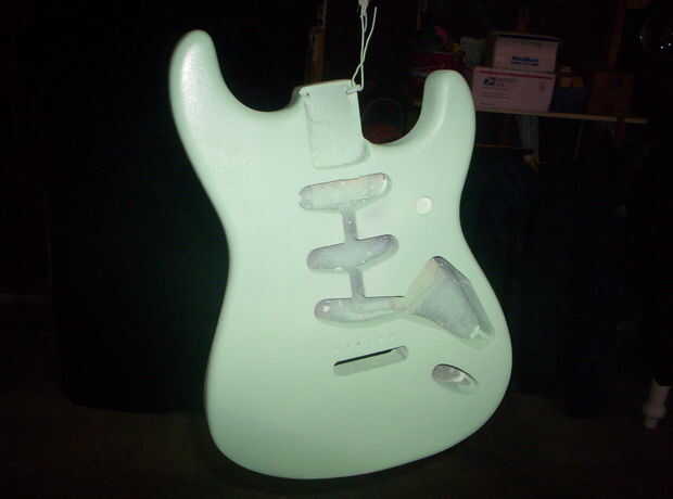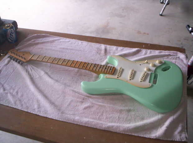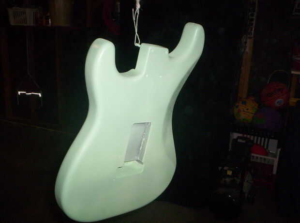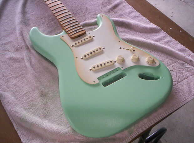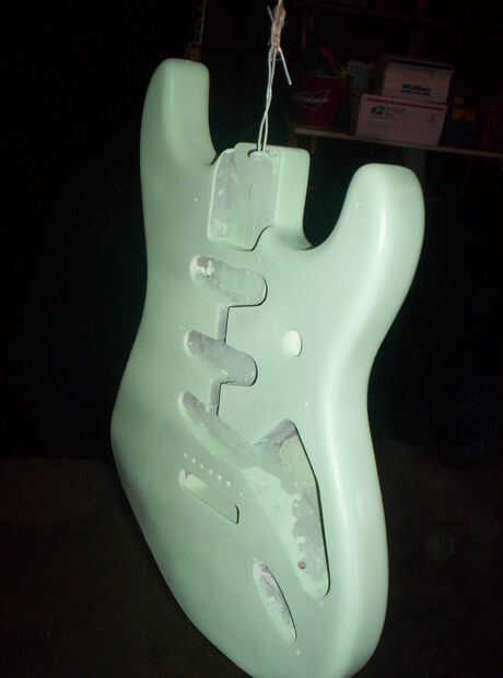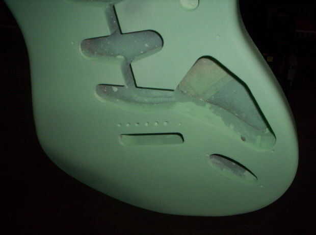 Que seca rápido, así que después de unas horas de la primera capa, empecé a mojar de color arena el cuerpo con grano 600. Esto demostró promesa como golpeó la mayoría de la polvoreda y me quedé con un aspecto de cáscara de naranja en el peor de los casos. Una 2 º capa llena en estas inmperfections con polvo más. Color arena mojada otra vez... Una 3ª capa, color arena húmeda con 800 esta vez. Ahora parece casi de fábrica antes de una capa transparente. No perfecta pero heck, va a ser una guitarra desgastada de carretera, por lo que no estoy siendo demasiado anal.