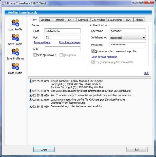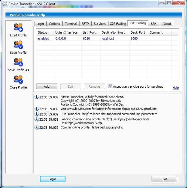 En este paso, a configurar su cliente SSH. En primer lugar, instalar su copia de Bitvise Tunnelier y puesta en marcha. Puede crear un perfil de conexión con dirección IP del servidor de Linux o el nombre de host y la información de inicio de sesión automático opcionalmente. La siguiente parte de este paso es completar los puertos que deben enviarse a través de SSH. Para el servidor de X de Windows, va adelante el linux los puertos del cuadro 6010 a Puerto de la caja windows 6000, donde se ejecuta XMing. Así, X servidor de Linux puede ejecutar sin perturbaciones, en el puerto 6000.