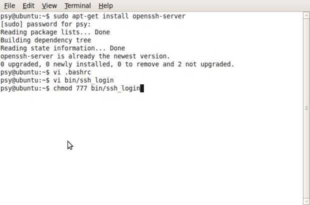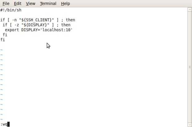 Después de guardar el archivo, ejecute el siguiente comando: "chmod 777 ${HOME} / bin/ssh_login" para hacer el script ejecutable. Lo que esto hace, es puntos de que cualquier programa de X comenzó desde una consola que es logueada vía SSH al puerto que redirija a la PC cliente SSH, en este caso, la PC de Windows con XMing. Esto sólo nos ahorra escribir lo mismo "DISPLAY =" línea cada vez que acceda a través de SSH.