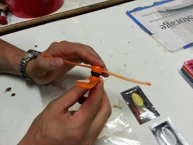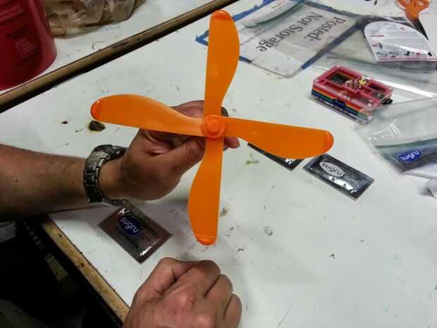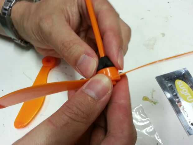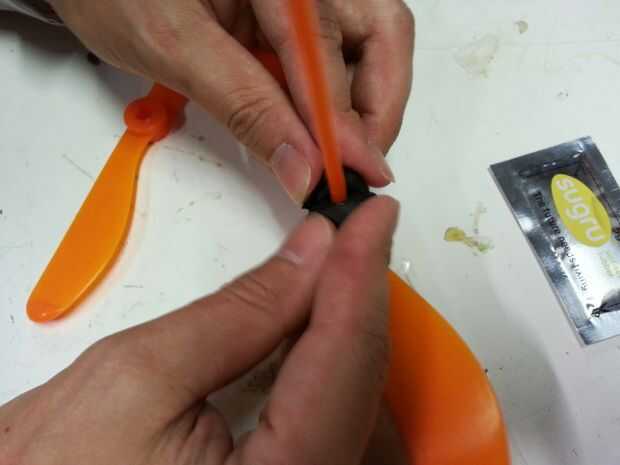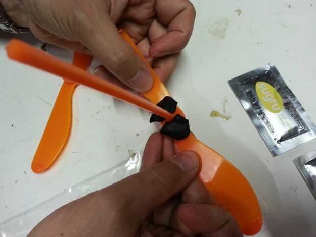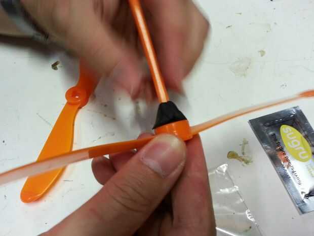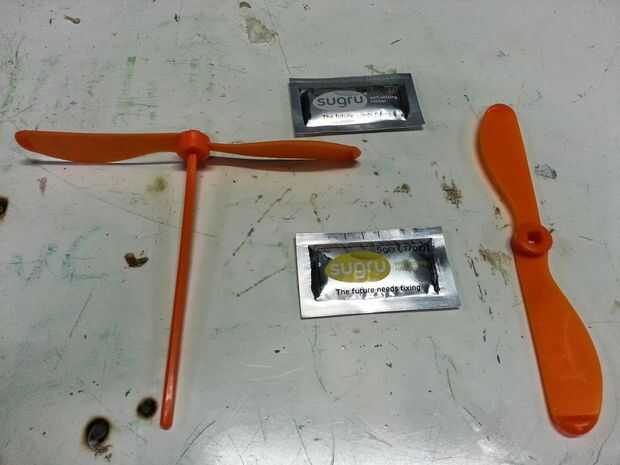 Toma el blob de tamaño de una cuarta parte del envase, partirla por la mitad y aplasta a ambos lados de la parte inferior de la primera hoja. Luego utilice sus dedos para aplastar contra la madre. Luego asegúrese de colocar la segunda hoja en frente a la derecha dirección. He incluido una foto con la hoja mal y otra vez con él derecho. Deslice la segunda hoja hasta el paso para que la ceremonia la sugru hacia abajo a través del agujero en el centro de la hoja para un buen agarre. Luego utilice sus dedos para aplastar la sugru alrededor de los bordes de los centros de cuchilla para un mejor agarre. Espere toda la noche se para en seco delante de un ventilador. Luego girar para arriba con las manos y tomar el sol en la gloria de su juguete del helicóptero de nuevo y mejorado de la mano!