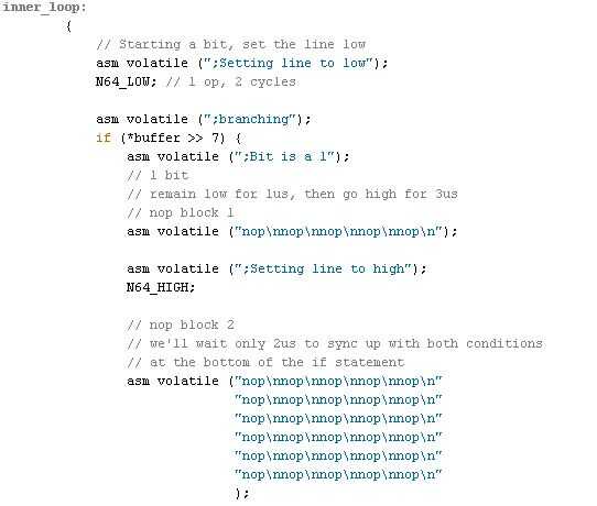 El código de Arduino en los métodos N64_send o N64_receive utilizar muy cuidadosamente programada Asamblea código escrito por Andrew Brown para bit-bang la línea de datos para comunicarse con el controlador. bloques de NOP sirven para esperar las cantidades apropiadas de μs antes de la línea de envío de datos de la interrogación.
