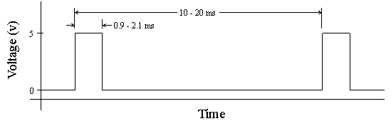 Se compone de pulsos de voltaje, la duración que determine el ángulo del eje de salida. Los pulsos pueden ser de 0,9 ms a 2,1 m de largo, 1,5 ms siendo la posición central (es decir, duración del pulso varía linealmente con el ángulo del eje). No recuerdo si 0,9 ms medios completamente en sentido horario o sentido de las manecillas, pero no es gran cosa para probar nuestro su proyecto, ver que el servo girando al revés y revertirla en su código. Un nuevo impulso debe enviarse al servo una vez cada 10 a 20 ms (50 a 100 Hz).