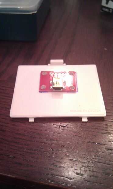 2) Coloque el lado plano de la placa breakout en la tapa de la batería. El breakout Junta acabe siendo en el exterior del compartimiento del bateador. (Usted puede embellecer aquí).