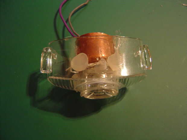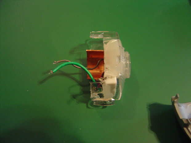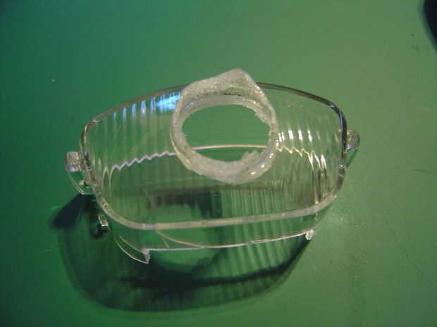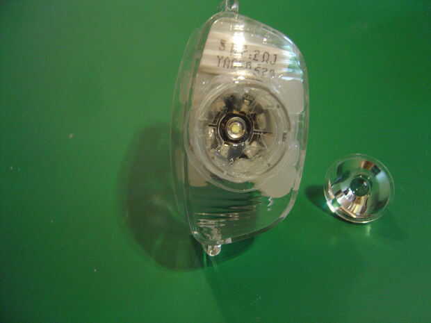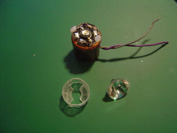 Debido a algunos problemas de espacio algunos cortes tuvieron que hacerse a la parte inferior de la lente de la linterna, el disipador térmico y la cara de la lente original. Una vez que se hizo todo, se pega y el Relais fue soldado en.