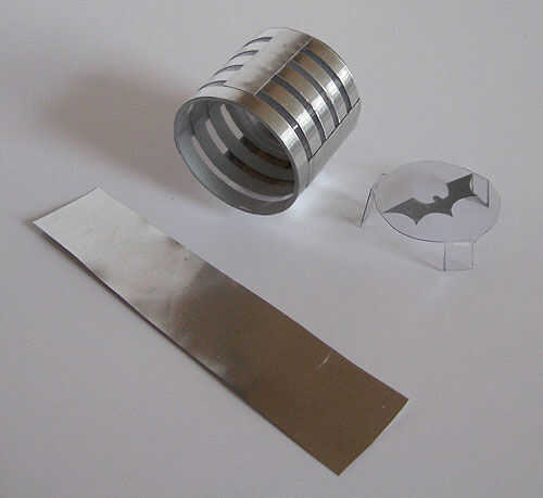 Recorta el logo del murciélago y usando cinta de doble cara pega a la lente en el centro. Pliegue las etiquetas hacia abajo.