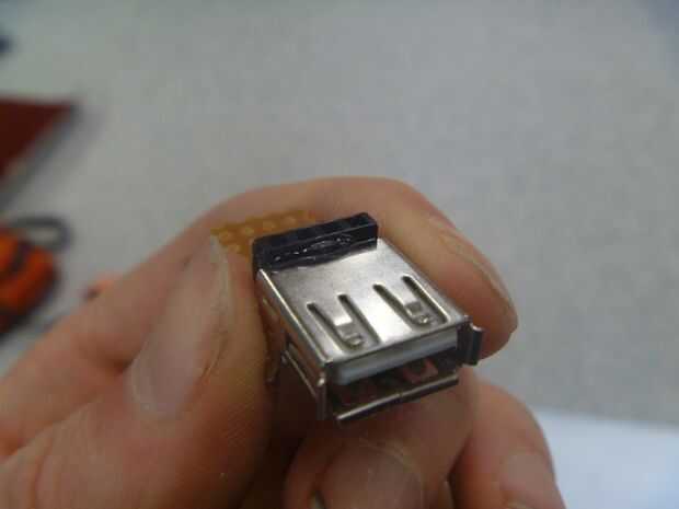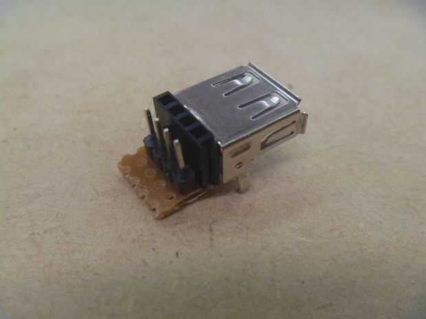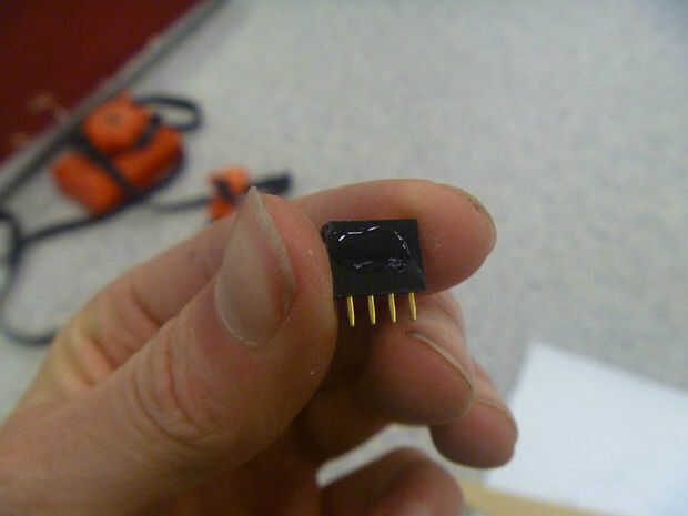 Si tienes una pistola de pegamento, aplique un poco de pegamento caliente en las clavijas hembra encabezado como se muestra en la primera imagen. Rápidamente ponen esto en la Junta de tira antes de que el pegamento se haya enfriado. Esto adhieren las clavijas de encabezado para el conector USB para realizar en conjunto más fuerte y más robusto.