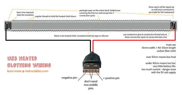 en un extremo de la tela alambre la - negativa y el otro extremo + positivo cable de la usb/batería. para ello, nos tira una cierta cantidad de alambre, el alambre desnudo es visible sin el plástico aislante.