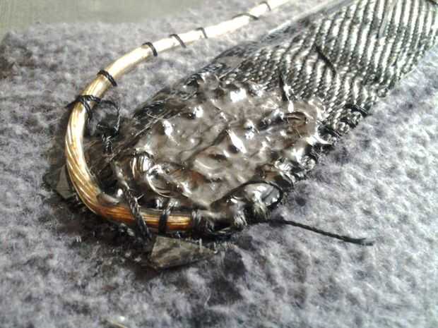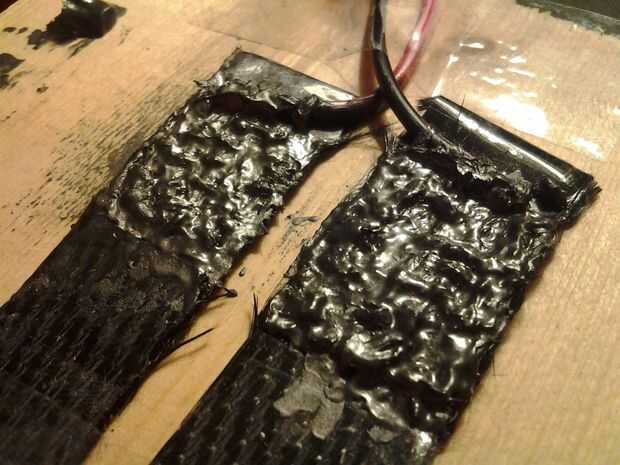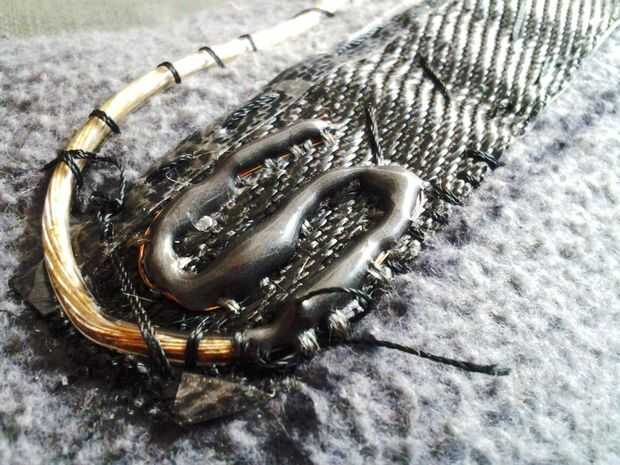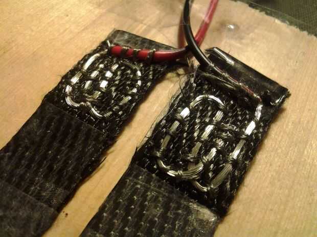 a continuación, cosemos el cable pelado en la la tela de fibra de carbono con el uso del hilo conductor.