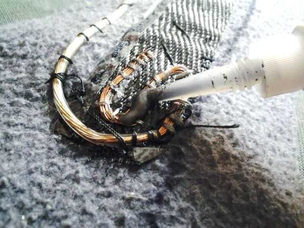 una vez que coser el alambre y paño juntos firmemente, utilizamos el pegamento conductor para hacer la conexión final.