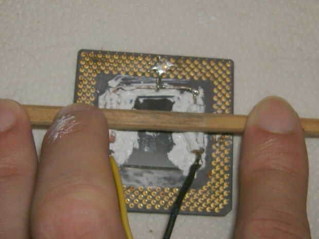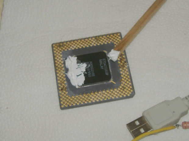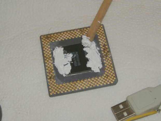El palillo se utilizó para extender la pasta térmica en el procesador. También se podría utilizar algún adhesivo térmico, oído hablar de él pero nunca visto estos. Hice algunos de soldadura entre el procesador y los resistores terminales para sujetar junto con un pedazo pequeño de ellos (solución del pobre por falta de adhesivo térmico).