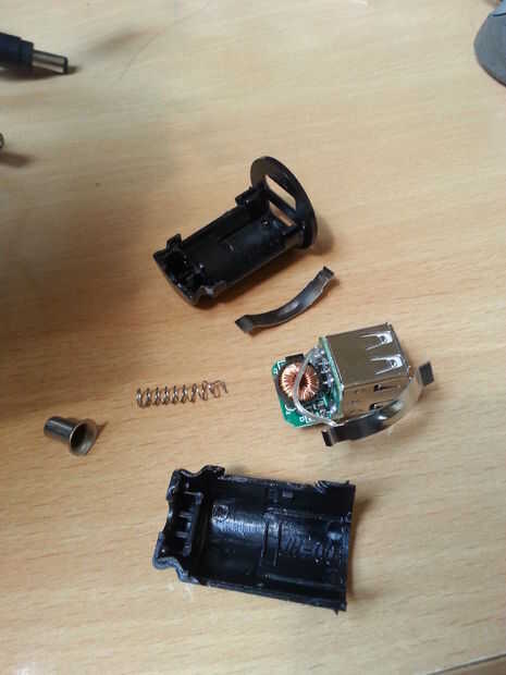 Lo rompió abierto y cortada de los resortes. Yo también ha confirmado que este modelo utiliza un regulador conmutado en lugar de un regulador lineal, por lo que no perdió más de la mitad de mi energía en calor. Lamentablemente no fotografiar la parte trasera antes del sellado para arriba, pero pude ver un chip con el código "ACT4060A". Una rápida lectura de la hoja de datos confirmó que fue cambiada y podría tomar hasta 2A.