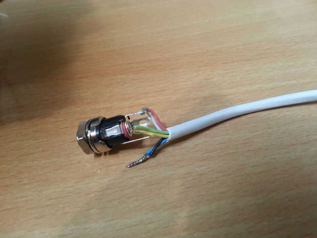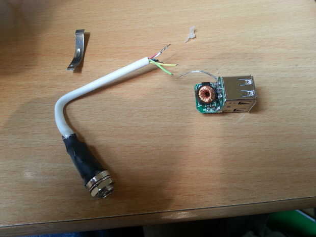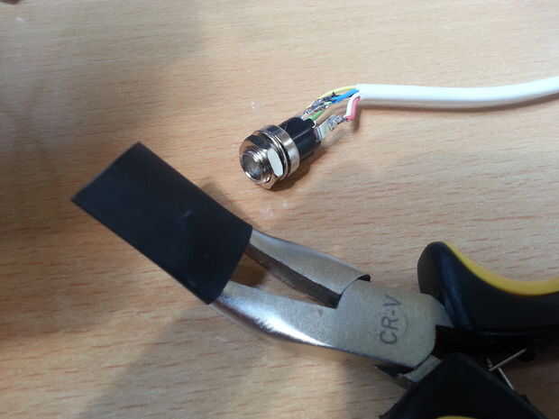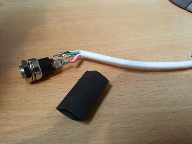 Tuve 6 base alarma cable a mano, así que utiliza. Porque podría haber hasta 1A viajando a través de este cable de bajo calibre, pareja les. Soldadas en toma de 2,1 mm y cubierto con encogimiento caliente del pegamento y del calor. Luego se suelda en el otro extremo el + 5V a donde acompañaba a la primavera y la toma de tierra para el cable de conectar los contactos laterales.