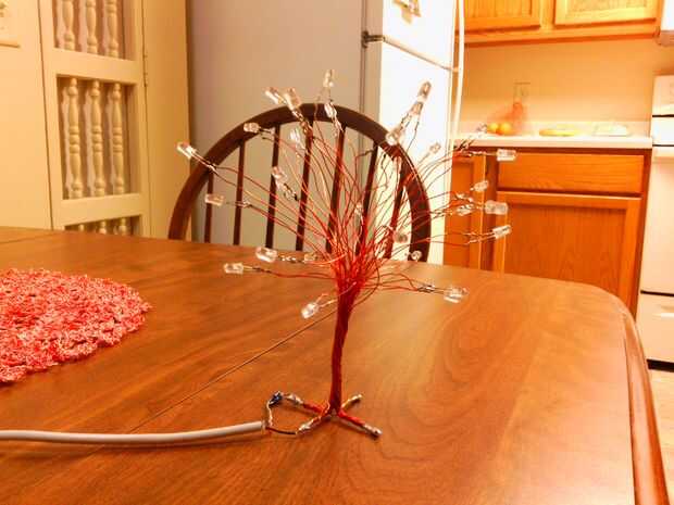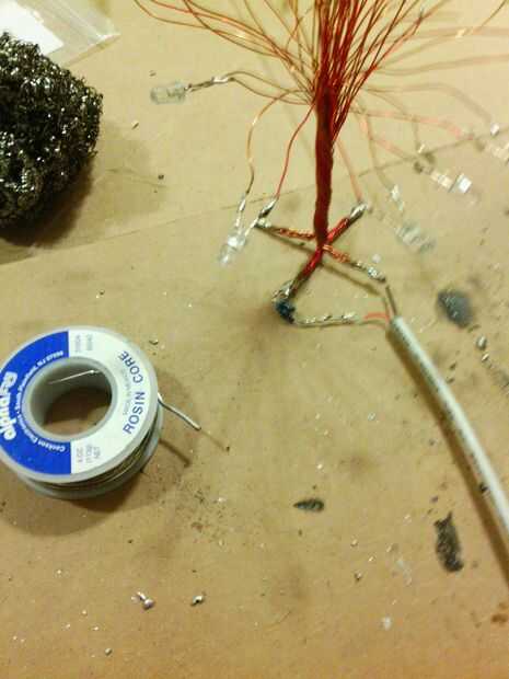 Tome un LED y la soldadura es más plomo (plomo ánodo o positivo) a una rama de cable rojo. Suelde el cable más corto (cátodo o negativa con el conductor) para un cable naranja. En este punto usted puede probar su circuito enchufando el cargador de pared USB y el cable USB. Debería ver la luz del LED 1 para arriba. Si no, asegúrese de que ninguno de los extremos rojo toquen las puntas naranja, causando un cortocircuito. Si todo está funcionando, desenchúfelo y soldadura 29 LEDs más.
