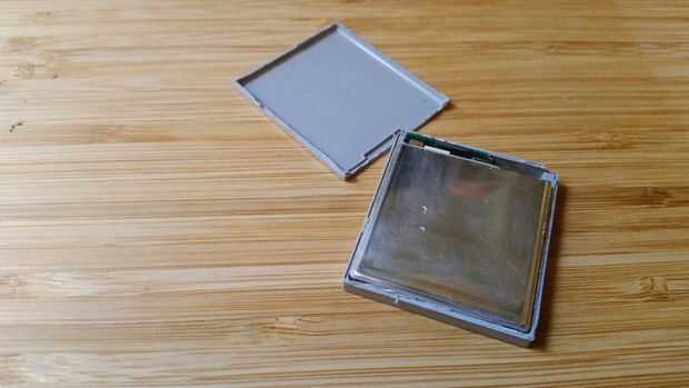 La batería del Li-ion ligeramente se pega a la parte inferior de la caja. Con la utilidad cuchillo intenta separar sin alterar el cuerpo de la batería. Simplemente deslice la hoja a lo largo de los bordes. Nuevamente, Manténgase alejado de los contactos en la parte delantera. Suavemente tire de la batería hacia arriba y sacarlo de la caja sin dañar los contactos. Si el pegamento es muy fuerte, podría voltear la pila y calentarlo un poco con un secador para suelta el adhesivo. En cualquier caso, no tire duro o se romperá la caja. Es débil y frágil y se rompe fácilmente.