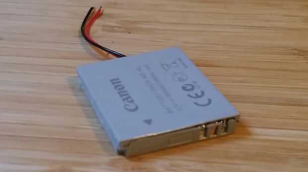 Ahora usted puede soldar los cables a los terminales (basta con mirar las fotos de la polaridad correcta). Porque yo no podía omitir la protección en el PCB de cualquier otra manera, tuve que soldar directamente en los contactos ellos mismos! Esto puede ser muy complicado y requiere de ciertos conocimientos de soldaduras y una punta pequeña. Personalmente corte corto terminales de resistencias, había hecho dos ganchos y soldar un extremo con los contactos y el otro a los cables. Luego, con la pistola de pegamento caliente, pegué el PBC en su lugar alineando cuidadosamente con los agujeros de la caja como se muestra en las fotos. Recuerde, el contacto en el medio no se usa. Hacer un pequeño agujero en la parte inferior de la caja de los cables que salen, pegue nuevamente la tapa y listo. Solo trata de no pegar el lado exterior de la cabina de otra manera no vuelva a colocar la batería en la cámara.