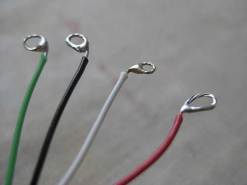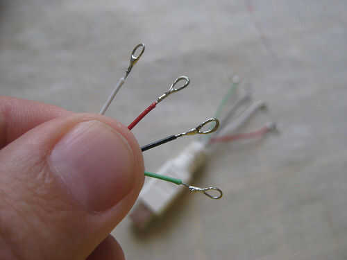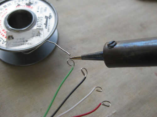 Una vez que los cables han sido despojados, hacer pequeños lazos como el extremo de cada alambre y usando un poco de soldadura, para fijar estos para que queden círculos cerrados.