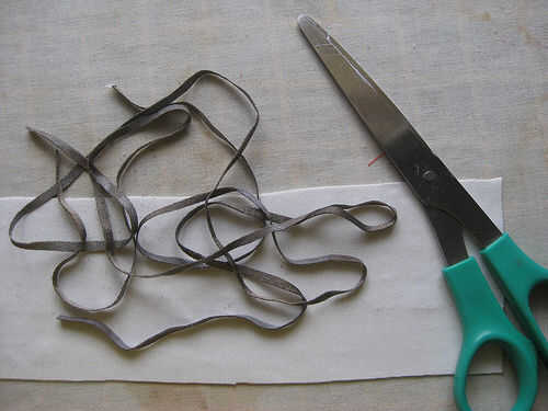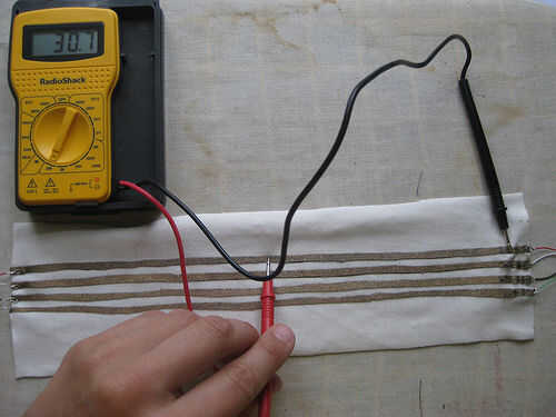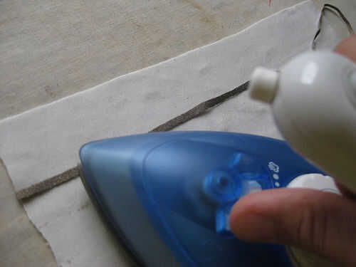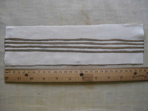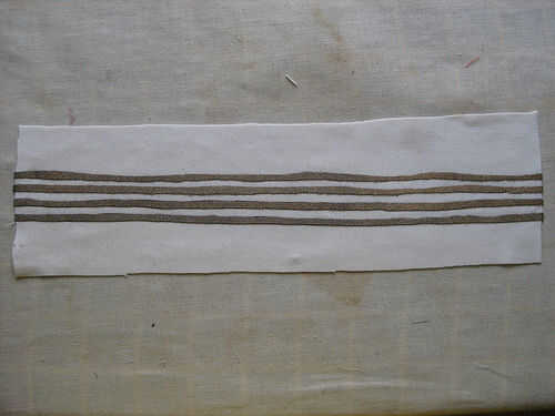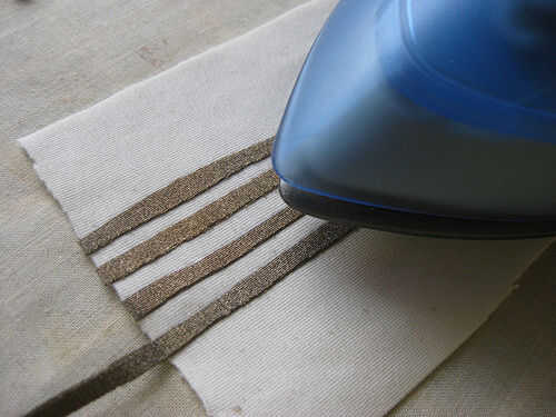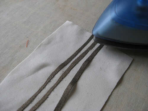 Coloque la pieza de tela de estiramiento regular sobre una tabla de planchar u otra superficie de plancha buena. Hierro plano y luego fundir (hierro-en) su conductor las tiras que van de un extremo a otro con unos 5 mm espacio entre.