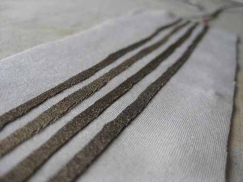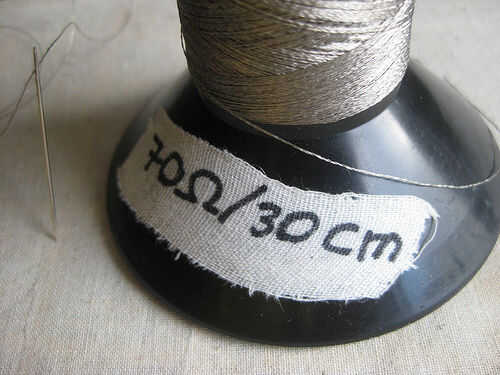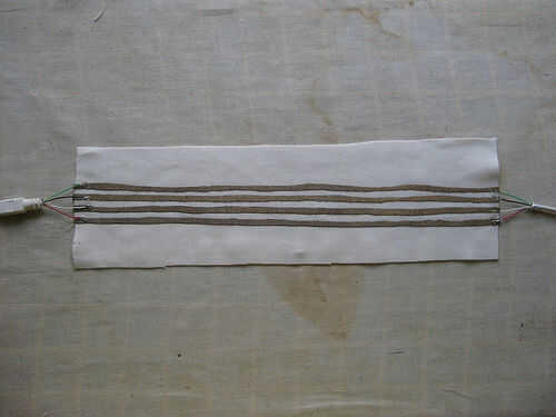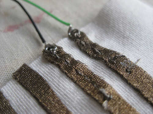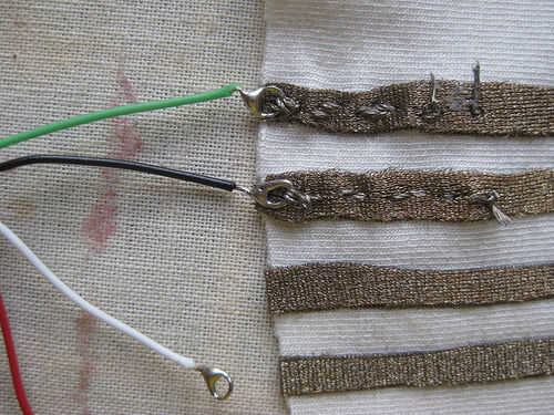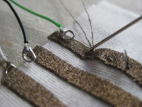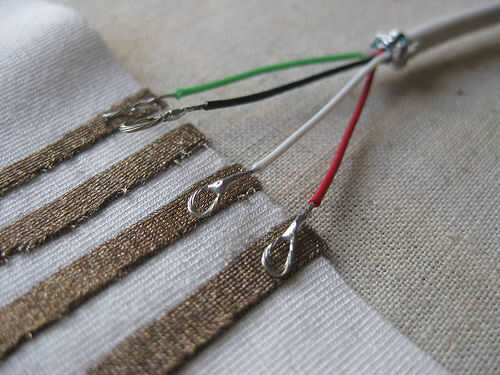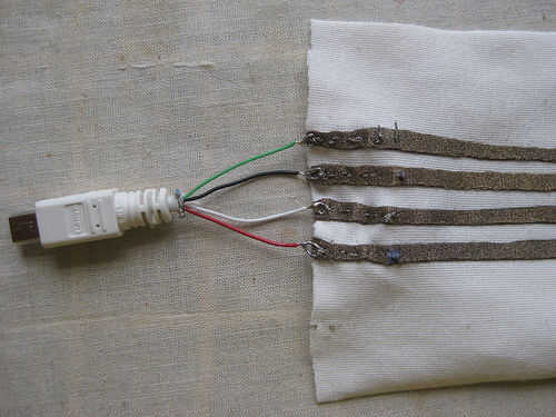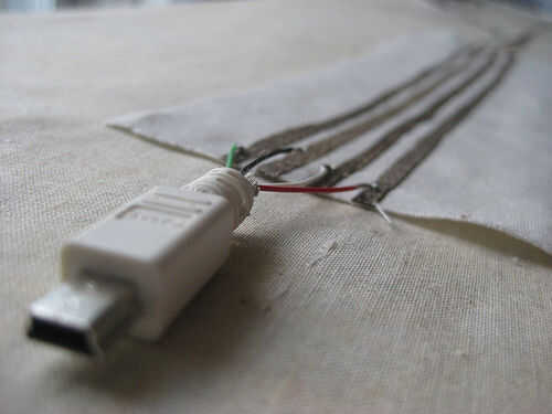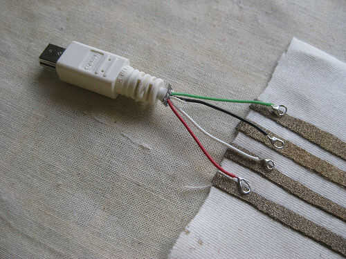 Enhebrar una aguja con hilo conductor y toma doble. Coser los lazos que soldada al extremo de los cables USB a las tiras conductoras. Hacer puntadas de al menos 3-4 conexión de los dos. Para el primer lado no importa cual cable de color se conecta al que tira. Pero para el segundo lado definitivamente desea Asegúrese de que coincidan todos los colores (verde a verde, rojo a rojo... cualquier color los cables el cable USB contiene).