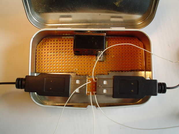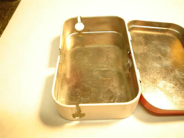 Averiguar el diseño de su proyecto en su recinto. Usé la lata Altoids siempre popular. Perfore un agujero en la parte posterior de la lata Altoids para el gran interruptor SPST, uno en el frente para el teclado cable USB y dos agujeros en los lados para las clavijas de la lámpara de lava USB. Corte ranuras de bocallave con un disco de corte dremel o sierra de mano hasta los agujeros frontales y laterales para los cables USB pueden caber en (ver imagen). Los agujeros con cinta adhesiva para evitar el corte de cables de la línea. Decidir sobre la forma de su perfboard para su circuito y cortar esa forma con una herramienta dremel. Esto va a ser un ajuste muy apretado...
