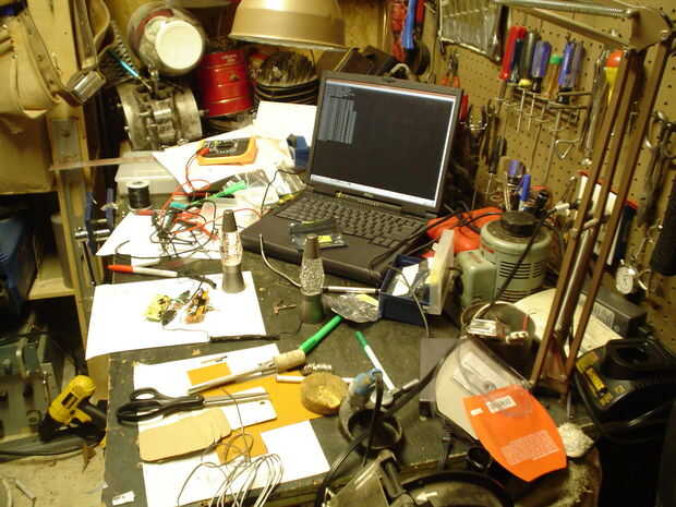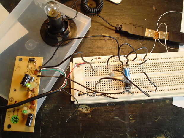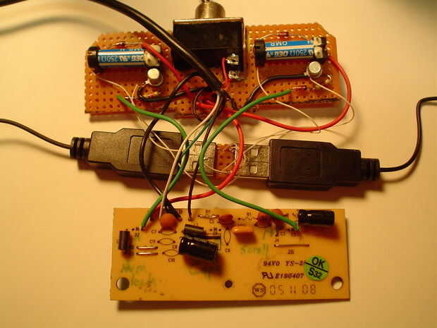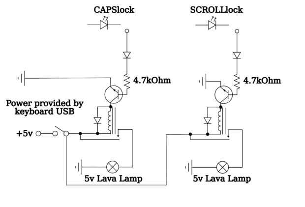 Usted tendrá que quitar los LEDs de la tarjeta de circuitos de teclado y determinar su polaridad y qué lado está conectado con un multímetro. Ejecute un cable de cada LED que participará en un circuito de conmutación (éstos están etiquetados SCROLLLOCK y CAPSLOCK en el esquema). Desoldar el + 5v y tierra desde el teclado del circuito para proporcionar energía a la perfboard y luego pase los cables para devolver el poder a la Junta (es la + 5V y un jardín, en el esquema). Seguir el esquema para hacer el circuito, usando las conexiones de los componentes para identificar las conexiones. Arme este circuito en un protoboard primero y probar el circuito. Este fue el paso donde determiné que los LEDs fueron dominadas en lugar de hacia abajo cambiaban y generalmente alcanzaron el punto de máximo caos en mi banco de trabajo. Cuando el circuito funciona (comprobable por golpear el Bloq Mayús o la tecla de bloqueo y ver si cambiar las lámparas de lava), averiguar cómo embalar los componentes en el perfboard. Wirewrap puede utilizarse, pero el método más simple de la Asamblea es simplemente empujar los componentes a través de orificios, enrolle juntos los cables y soldarlos juntos. Prueba que el circuito montado en el perfboard.