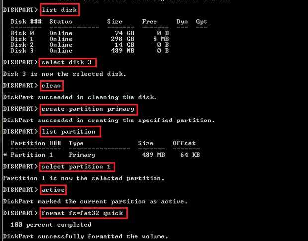 Nota: Si en cualquier momento las siguientes instrucciones no funcionan para usted, puede ser porque la versión de diskpart que viene con tus sistema operativo windows es el más viejo o más nuevo que el usado para este tutorial. Trate de usar el "?" para ver las opciones que más coincidan con los utilizados en este tutorial.