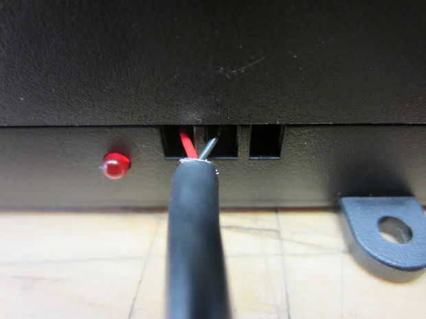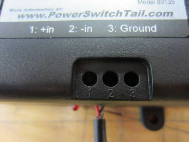 Aflojar los tornillos a los dos conectores de la izquierda en la cola de PowerSwitch para utilizando el destornillador de precisión.  Inserte suavemente la parte pelada del cable rojo en el agujero de la izquierda (con la etiqueta "1: + en") y la parte pelada del cable negro en el agujero del medio (etiquetado "2:-en") y apriete los tornillos como se muestra en las fotos adjuntas.