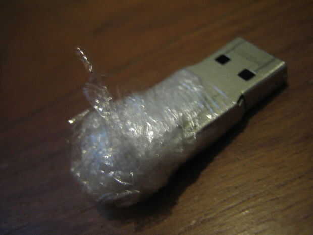 Agarrar su clingwrap, colocarlo para que no se cubre la cabeza del USB (que es el puerto de conexión) y empezar a envolver. Continuar hasta la cobertura completa de thumbdrive.
