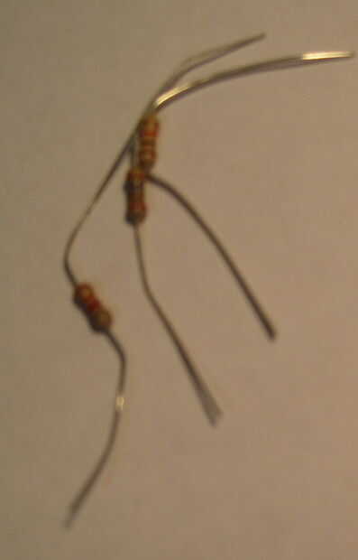 -dos resistencias (1/4 watt), mi LED luz de batería fue nominal de 3.6v, así que un 3 K ohm y un k 4 ohmios podría ser ideal. No pude encontrar estos, así que sustituido. Mis resistencias me dieron sólo 3 voltios, y ahora mis LEDs son dim cuando cargado USB