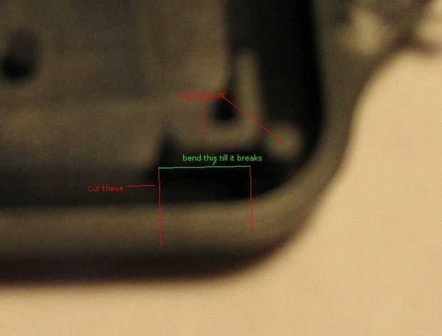 Simplemente se deshizo de las cosas 1 (como en la primera plaza amarillo) y corte en las líneas rojas, doblada hasta que se rompió en la línea verde. Esto hace espacio para mi cable USB para adaptarse. Usted puede tener que ver cosas diferentemente es el cable USB es diferente.