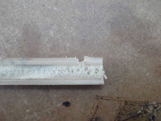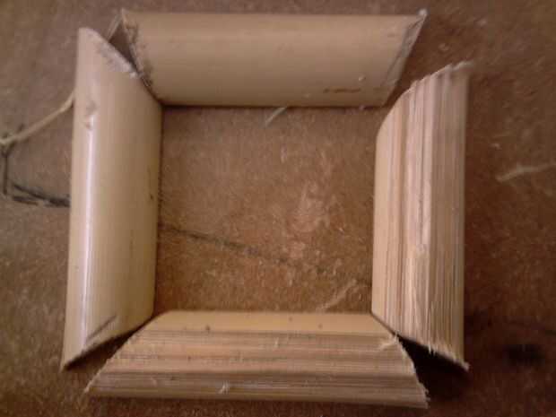 Las dos piezas de bambú la misma longitud que el ventilador y las dos piezas de bambú el mismo ancho que el ventilador debe dividirse en dos, verticalmente abajo del grano, como se muestra en la imagen.