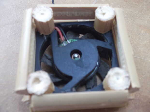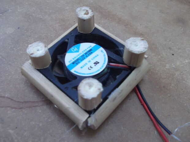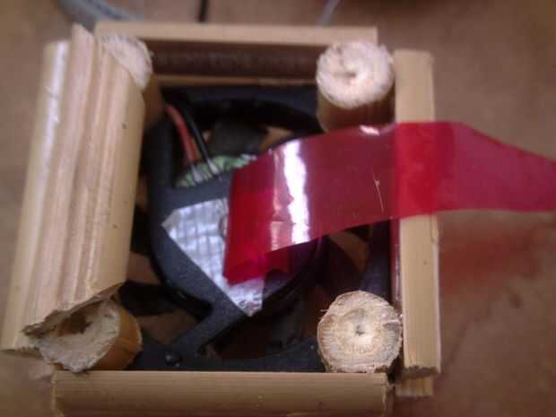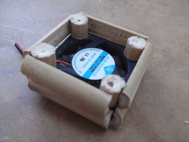 Aquí está la diversión poco:): pegarse. Uso la pistola de pegamento para pegar la cara plana de dos de sus cuatro piezas de la misma longitud que el ventilador a los dos bordes exteriores enfrentados de su ventilador (las longitudes). Repita con dos de las piezas de anchura. Dejar enfriar. Luego se pegan las caras circulares de cuatro de sus ocho piezas de bambú con el mismo diámetro que su longitud a las cuatro esquinas de la cara superior de la fan (funciona mejor si usted ahuecar el centro suave de las piezas y pone pegamento en el agujero hecho). Una vez más, dejar enfriar. Luego pegar el sobrante y anchura para las ayudas que acaba de hacer poniendo una cucharada pequeña de pegamento caliente en el cada extremo de la cara plana y presionando contra el soporte. Dejar enfriar. A continuación añadir las piernas. Para ello, se peguen las caras circulares de las restantes cuatro piezas de bambú que son la misma longitud que su diámetro en las cuatro esquinas de la cara inferior del ventilador, como hizo con los últimos cuatro de estas piezas. Dejar enfriar (otra vez). Último, vuelta a vuelta la cosa y organizar las formas de trapecio en a, por lo que mienten a los apoyos. Pegamento en su lugar, dejar enfriar, y eso es lo más difícil encima y hecho con.