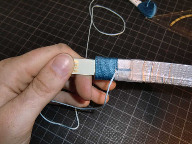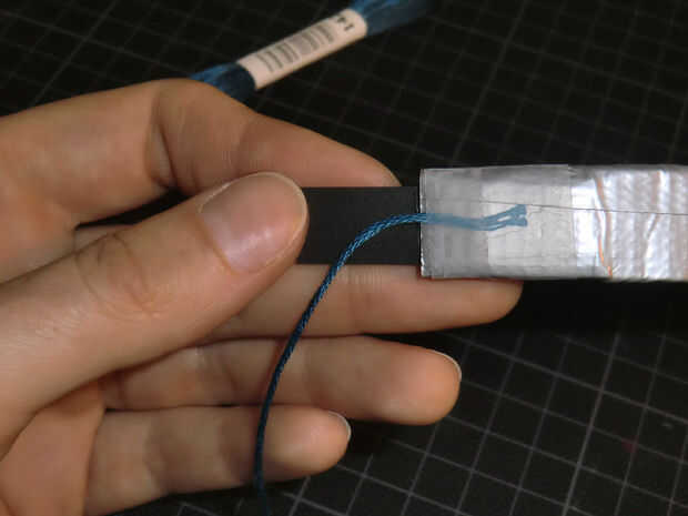 Use cinta para fijar el primer hilo y aplica pegamento en el borde de su pulsera, para evitar que se deslice y caiga. Envuelva el hilo alrededor de tu pulsera, como cerca como puedas y una vez que la cinta el fin tal como se muestra en la segunda imagen. Para cambiar la cinta de color una nueva un poco por encima de la anterior y Envuélvala alrededor tan cerca, como sea posible. Una vez que termines asegure el extremo del último color aplicando pegamento por debajo de ella.