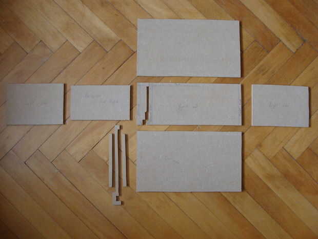 Me dibujo en mi cabeza, así que no usé todas las formas pero hice formas para usted. Así que primero dibujo partes de la madera y cortar con el sable vio, puede imprimir formas y pegarlas en madera hacia fuera o dibujarlo por sí mismo. Preparo para usted PDF con tamaños si quieres dibujar por sí mismo. Al terminar con el dibujo debe sólo recorte las piezas.