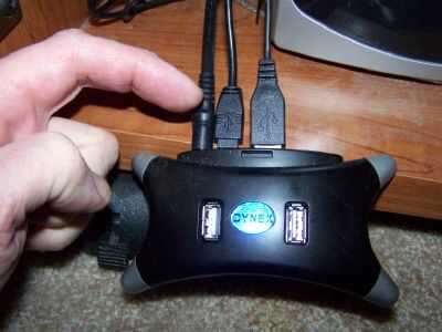 El breve Dynex manual incluido con el cubo en realidad aborda el problema, dando ambos un motivo y una solución. Mi dedo apunta hacia el enchufe y la clavija de conexión al puerto USB en la parte posterior de la computadora. El tercer conector en el cuadro conecta mi reproductor de MP3 a la computadora.