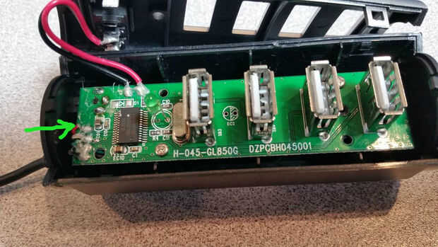 Localizar donde cable USB se conecta al tablero de circuito, en la foto de arriba, en el extremo izquierdo de la placa de circuito.