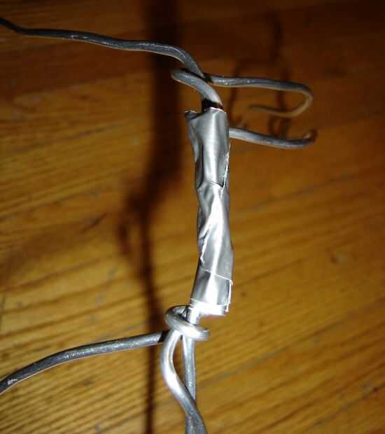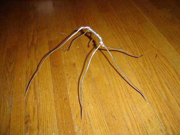 Corte tres piezas de tres pies de alambre de armadura, paquete para arriba y tuerza en el medio. Deben permanecer juntos y no importa si pueden moverse ligeramente o sonajero. Un poco de cinta adhesiva para conductos (el primero de muchos) se encargará de cuando está envuelto para arriba.
