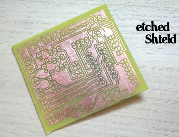El escudo es compatible con todas las versiones de placas Arduino. Empezar a hacer el escudo por imprimir el trazado (dado abajo). Imprimir en un papel brillante y hacer la tabla utilizando el método de transferencia de tóner.